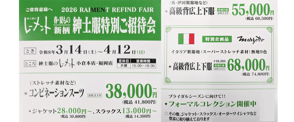 フレッシャーズ&就活 応援フェア開催中 自分だけのこだわりのオーダースーツ RAIMENTでは 国産・舶来服地約1,000着の品揃え、 裏地・釦もセレクトできます。(一部有料あり) 自社 …