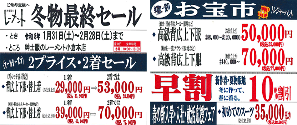 年末早期承り会:令和7年12月20日(土)~28日(日) 初売:令和8年1月3日(土)~25日(日) 営業時間:AM10:00~PM6:00 ところ:レーメント小倉本店・レーメント福岡店 高級素材のご提案! …