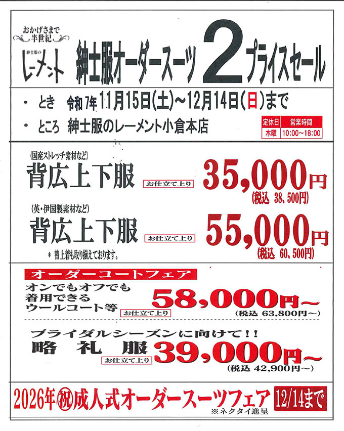 この度、紳士服オーダースーツ特別セールを下記の日程で開催しております。