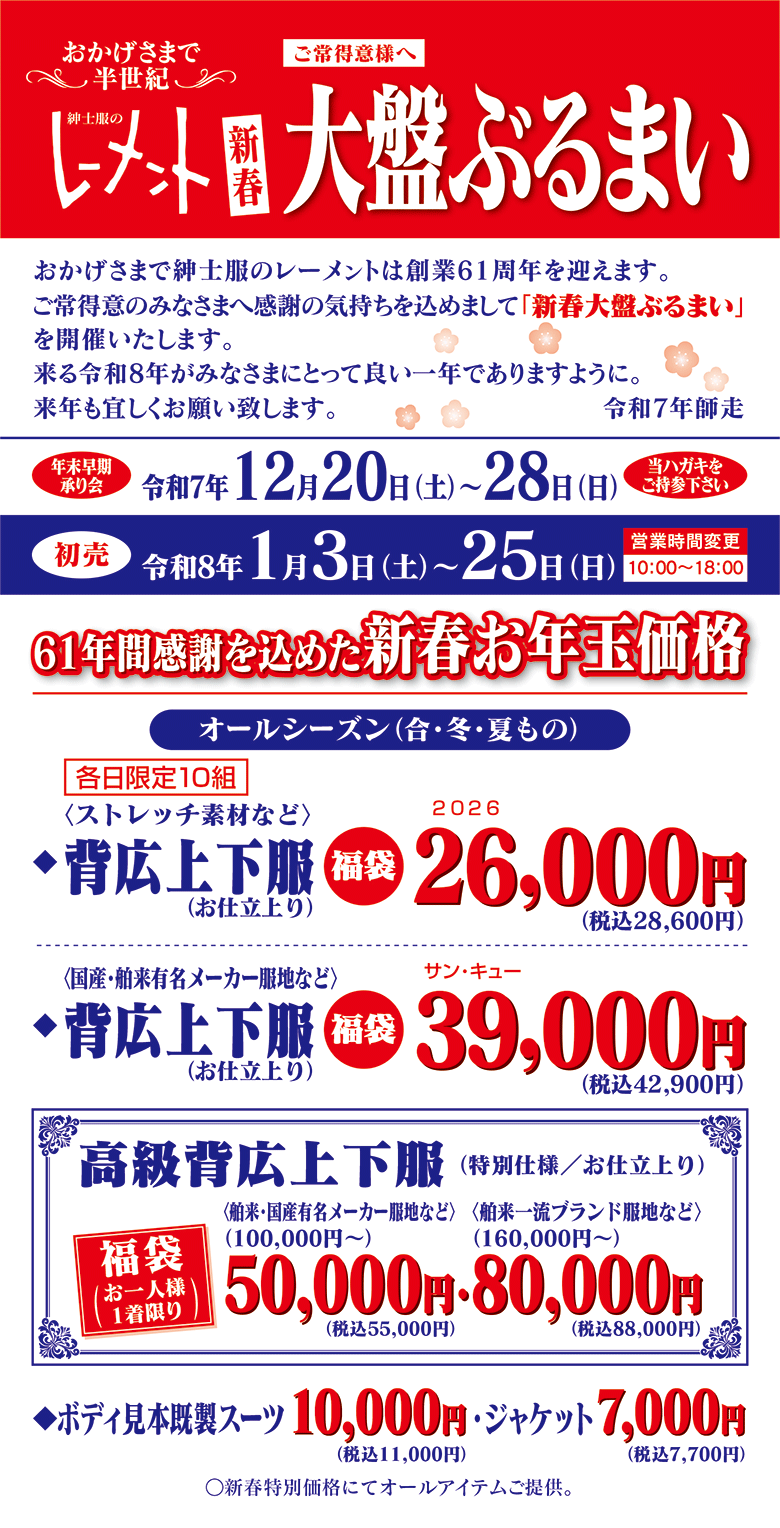 おかげさまで紳士服のレーメントは「60年からの新たな一歩」「信頼の一着を信頼の価格で」をモットーに、皆様の満足いただける商品をご提供いたします。